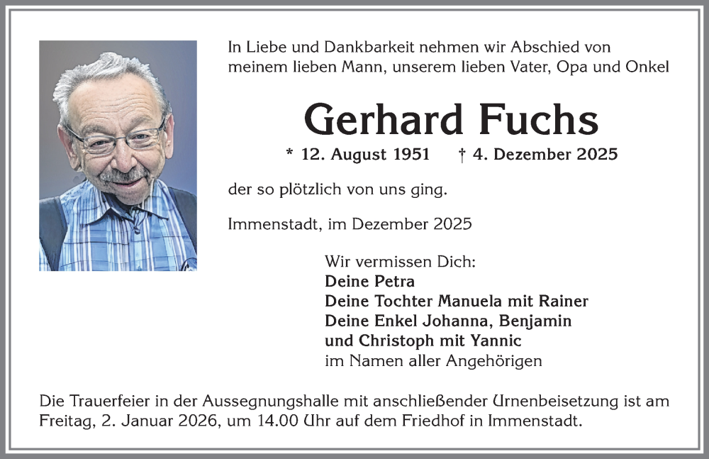 Hier finden Sie alle Traueranzeigen aus der Zeitung, die bisher für Gerhard Fuchs erschienen sind. Weitere Traueranzeigen, die in der Zeitung erscheinen, werden hier ebenfalls aufgelistet