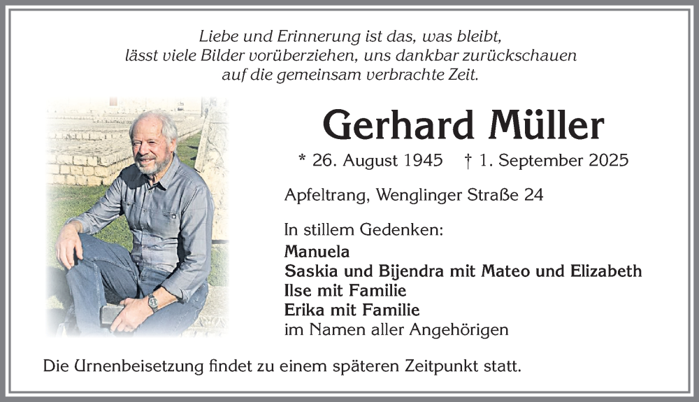 Hier finden Sie alle Traueranzeigen aus der Zeitung, die bisher für Gerhard Müller erschienen sind. Weitere Traueranzeigen, die in der Zeitung erscheinen, werden hier ebenfalls aufgelistet