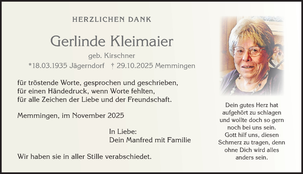 Hier finden Sie alle Traueranzeigen aus der Zeitung, die bisher für Gerlinde Kleimaier erschienen sind. Weitere Traueranzeigen, die in der Zeitung erscheinen, werden hier ebenfalls aufgelistet