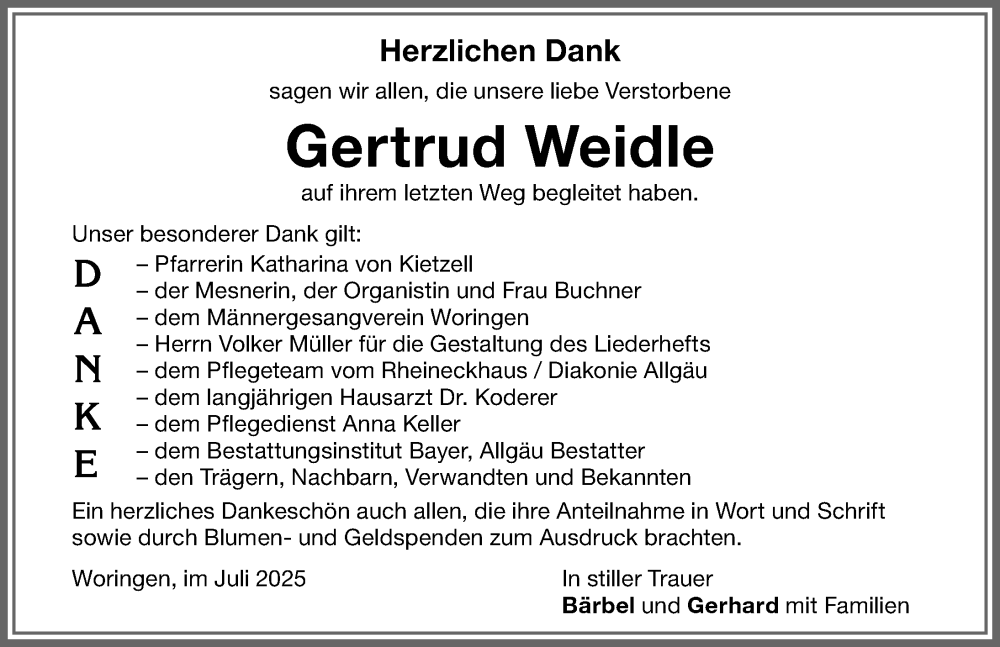 Hier finden Sie alle Traueranzeigen aus der Zeitung, die bisher für Gertrud Weidle erschienen sind. Weitere Traueranzeigen, die in der Zeitung erscheinen, werden hier ebenfalls aufgelistet