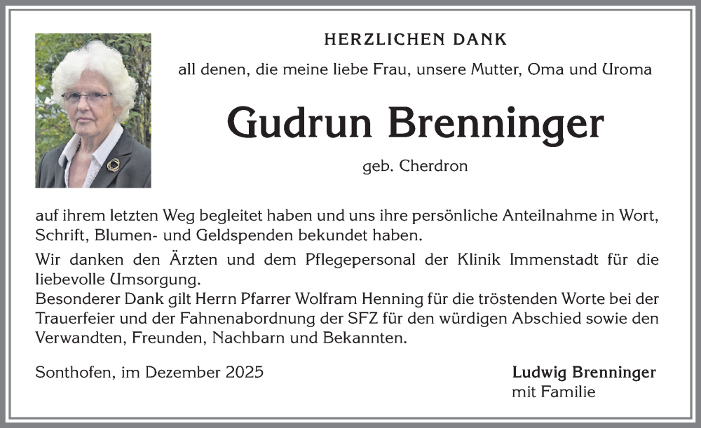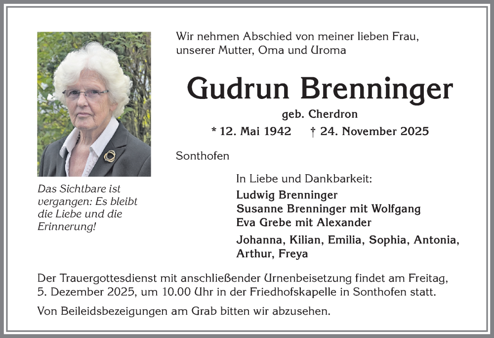 Hier finden Sie alle Traueranzeigen aus der Zeitung, die bisher für Gudrun Brenninger erschienen sind. Weitere Traueranzeigen, die in der Zeitung erscheinen, werden hier ebenfalls aufgelistet