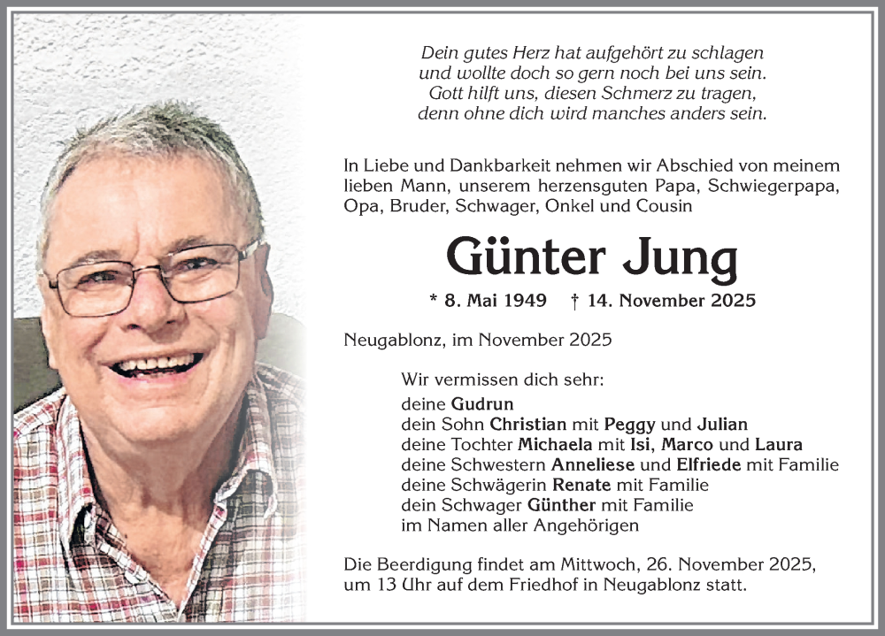 Hier finden Sie alle Traueranzeigen aus der Zeitung, die bisher für Günter Jung erschienen sind. Weitere Traueranzeigen, die in der Zeitung erscheinen, werden hier ebenfalls aufgelistet