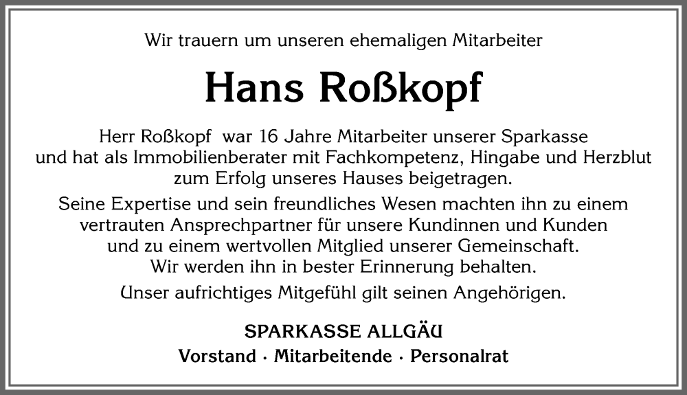 Hier finden Sie alle Traueranzeigen aus der Zeitung, die bisher für Hans Roßkopf erschienen sind. Weitere Traueranzeigen, die in der Zeitung erscheinen, werden hier ebenfalls aufgelistet