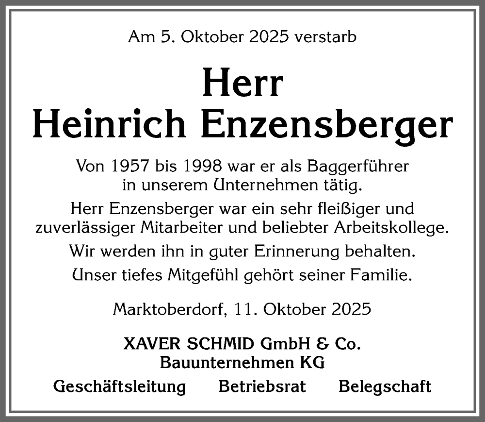 Hier finden Sie alle Traueranzeigen aus der Zeitung, die bisher für Heinrich Enzensberger erschienen sind. Weitere Traueranzeigen, die in der Zeitung erscheinen, werden hier ebenfalls aufgelistet