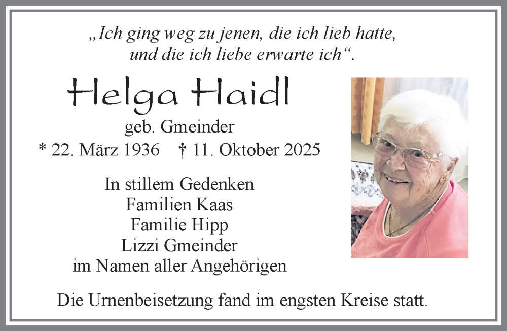 Hier finden Sie alle Traueranzeigen aus der Zeitung, die bisher für Helga Haidl erschienen sind. Weitere Traueranzeigen, die in der Zeitung erscheinen, werden hier ebenfalls aufgelistet