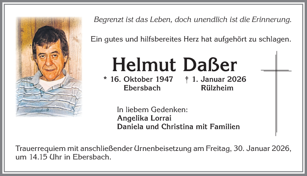 Hier finden Sie alle Traueranzeigen aus der Zeitung, die bisher für Helmut Daßer erschienen sind. Weitere Traueranzeigen, die in der Zeitung erscheinen, werden hier ebenfalls aufgelistet