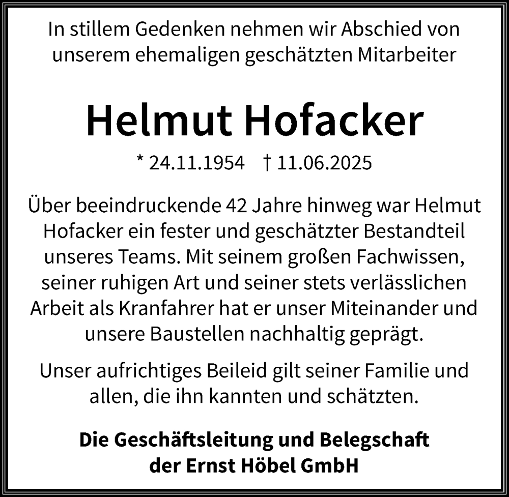 Hier finden Sie alle Traueranzeigen aus der Zeitung, die bisher für Helmut Hofacker erschienen sind. Weitere Traueranzeigen, die in der Zeitung erscheinen, werden hier ebenfalls aufgelistet