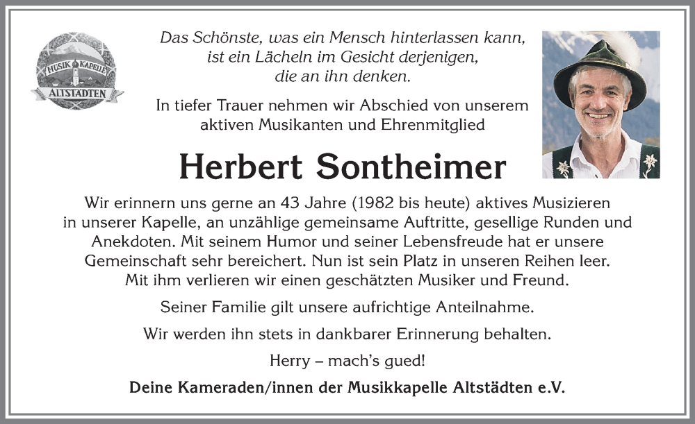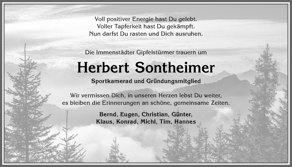 Hier finden Sie alle Traueranzeigen aus der Zeitung, die bisher für Herbert Sontheimer erschienen sind. Weitere Traueranzeigen, die in der Zeitung erscheinen, werden hier ebenfalls aufgelistet