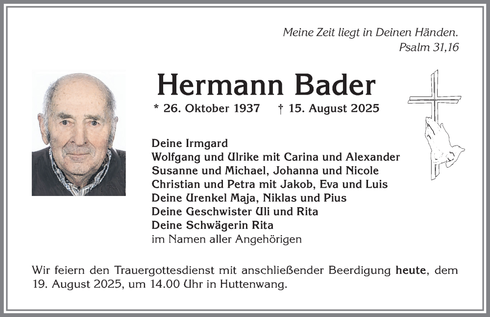 Hier finden Sie alle Traueranzeigen aus der Zeitung, die bisher für Hermann Bader erschienen sind. Weitere Traueranzeigen, die in der Zeitung erscheinen, werden hier ebenfalls aufgelistet