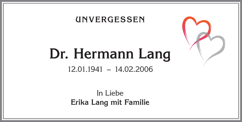 Hier finden Sie alle Traueranzeigen aus der Zeitung, die bisher für Hermann Lang erschienen sind. Weitere Traueranzeigen, die in der Zeitung erscheinen, werden hier ebenfalls aufgelistet