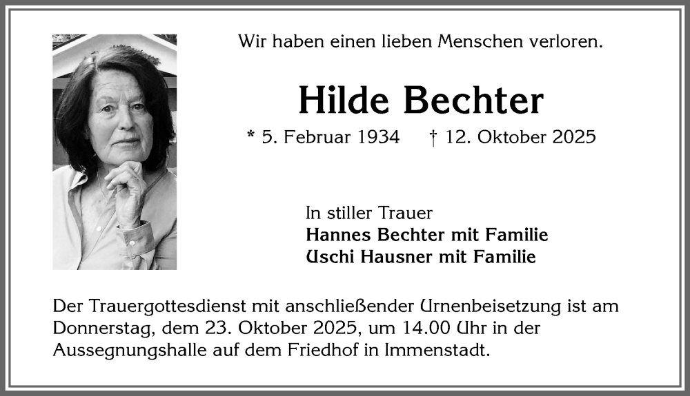 Hier finden Sie alle Traueranzeigen aus der Zeitung, die bisher für Hilde Bechter erschienen sind. Weitere Traueranzeigen, die in der Zeitung erscheinen, werden hier ebenfalls aufgelistet
