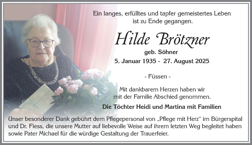 Hier finden Sie alle Traueranzeigen aus der Zeitung, die bisher für Hilde Brötzner erschienen sind. Weitere Traueranzeigen, die in der Zeitung erscheinen, werden hier ebenfalls aufgelistet