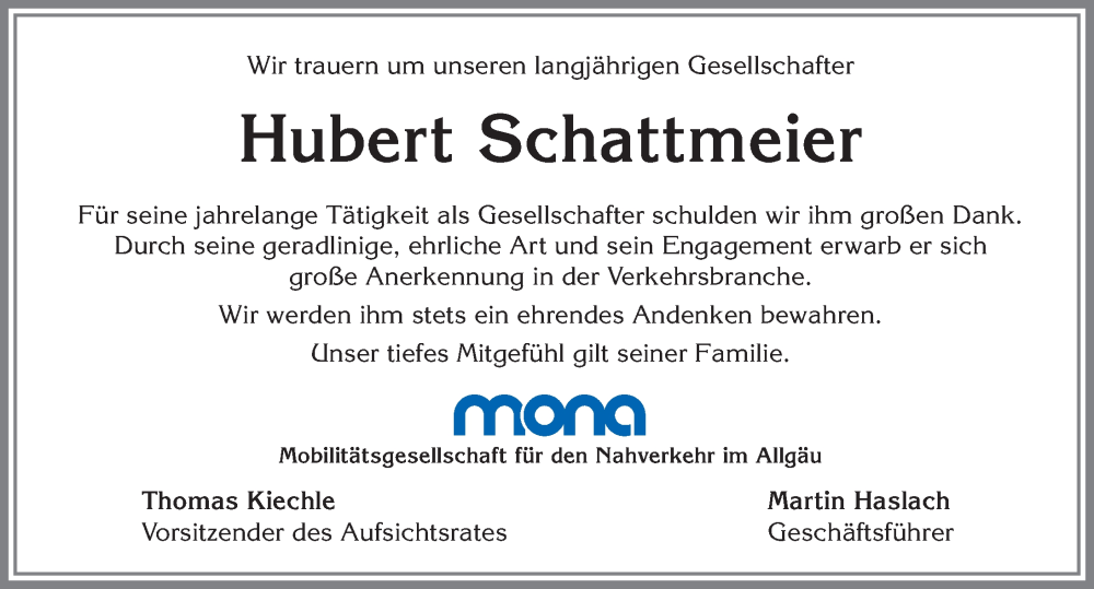Hier finden Sie alle Traueranzeigen aus der Zeitung, die bisher für Hubert Schattmeier erschienen sind. Weitere Traueranzeigen, die in der Zeitung erscheinen, werden hier ebenfalls aufgelistet