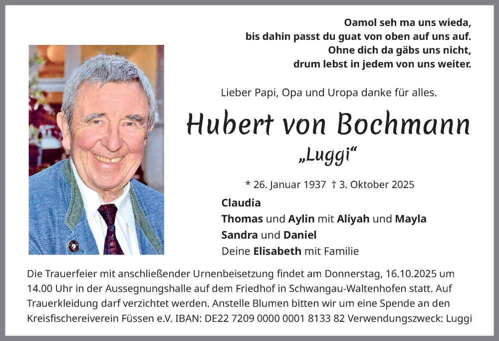Hier finden Sie alle Traueranzeigen aus der Zeitung, die bisher für Hubert von Bochmann erschienen sind. Weitere Traueranzeigen, die in der Zeitung erscheinen, werden hier ebenfalls aufgelistet