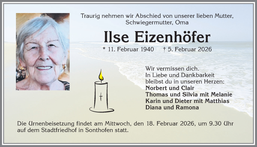 Hier finden Sie alle Traueranzeigen aus der Zeitung, die bisher für Ilse Eizenhöfer erschienen sind. Weitere Traueranzeigen, die in der Zeitung erscheinen, werden hier ebenfalls aufgelistet