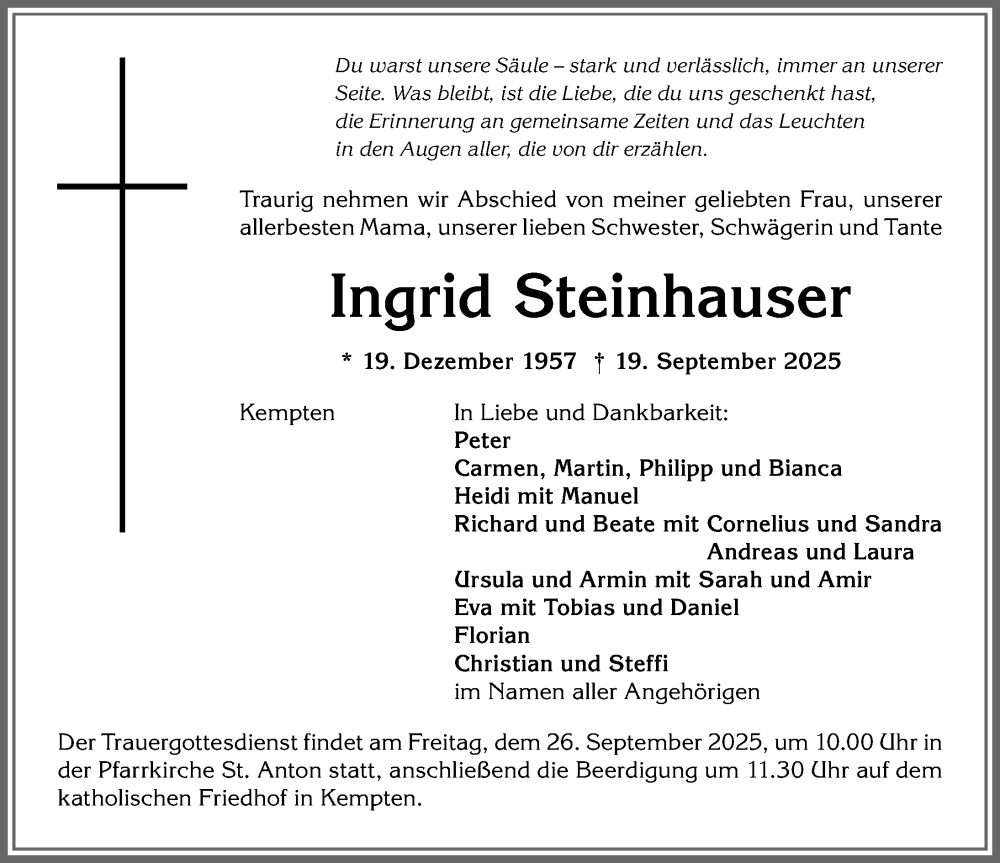 Hier finden Sie alle Traueranzeigen aus der Zeitung, die bisher für Ingrid Steinhauser erschienen sind. Weitere Traueranzeigen, die in der Zeitung erscheinen, werden hier ebenfalls aufgelistet