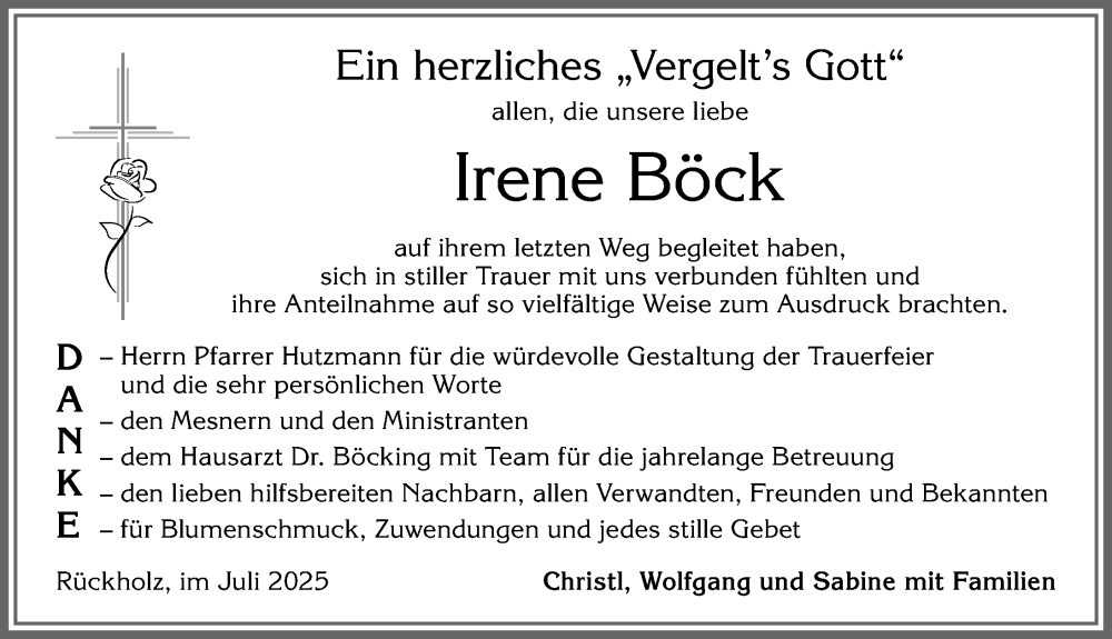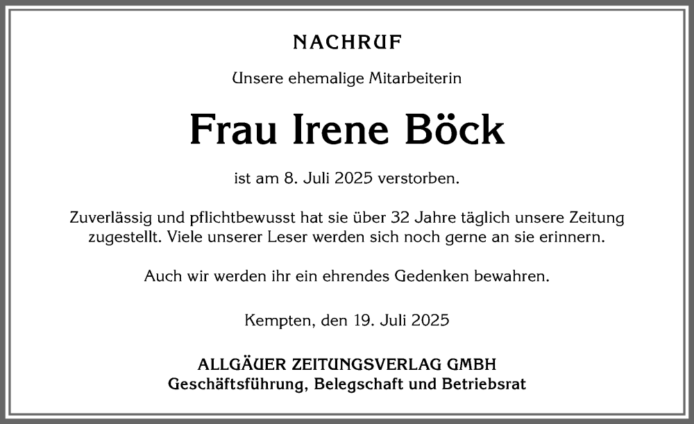 Hier finden Sie alle Traueranzeigen aus der Zeitung, die bisher für Irene Böck erschienen sind. Weitere Traueranzeigen, die in der Zeitung erscheinen, werden hier ebenfalls aufgelistet