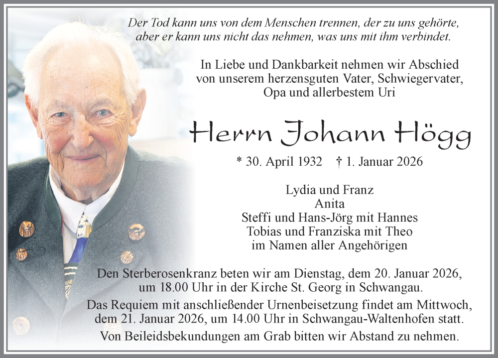 Hier finden Sie alle Traueranzeigen aus der Zeitung, die bisher für Johann Högg erschienen sind. Weitere Traueranzeigen, die in der Zeitung erscheinen, werden hier ebenfalls aufgelistet