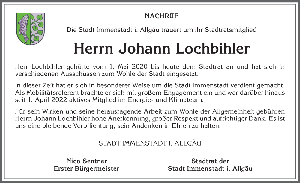 Hier finden Sie alle Traueranzeigen aus der Zeitung, die bisher für Johann Lochbihler erschienen sind. Weitere Traueranzeigen, die in der Zeitung erscheinen, werden hier ebenfalls aufgelistet