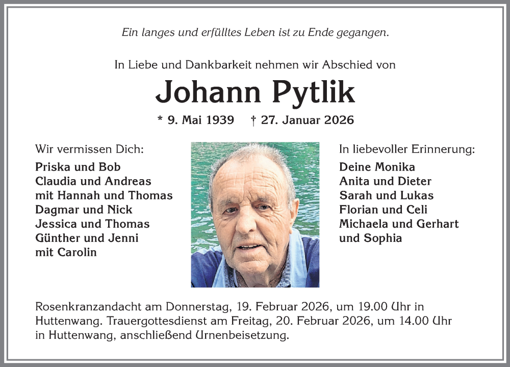 Hier finden Sie alle Traueranzeigen aus der Zeitung, die bisher für Johann Pytlik erschienen sind. Weitere Traueranzeigen, die in der Zeitung erscheinen, werden hier ebenfalls aufgelistet