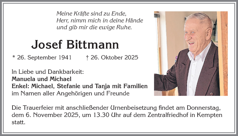 Hier finden Sie alle Traueranzeigen aus der Zeitung, die bisher für Josef Bittmann erschienen sind. Weitere Traueranzeigen, die in der Zeitung erscheinen, werden hier ebenfalls aufgelistet