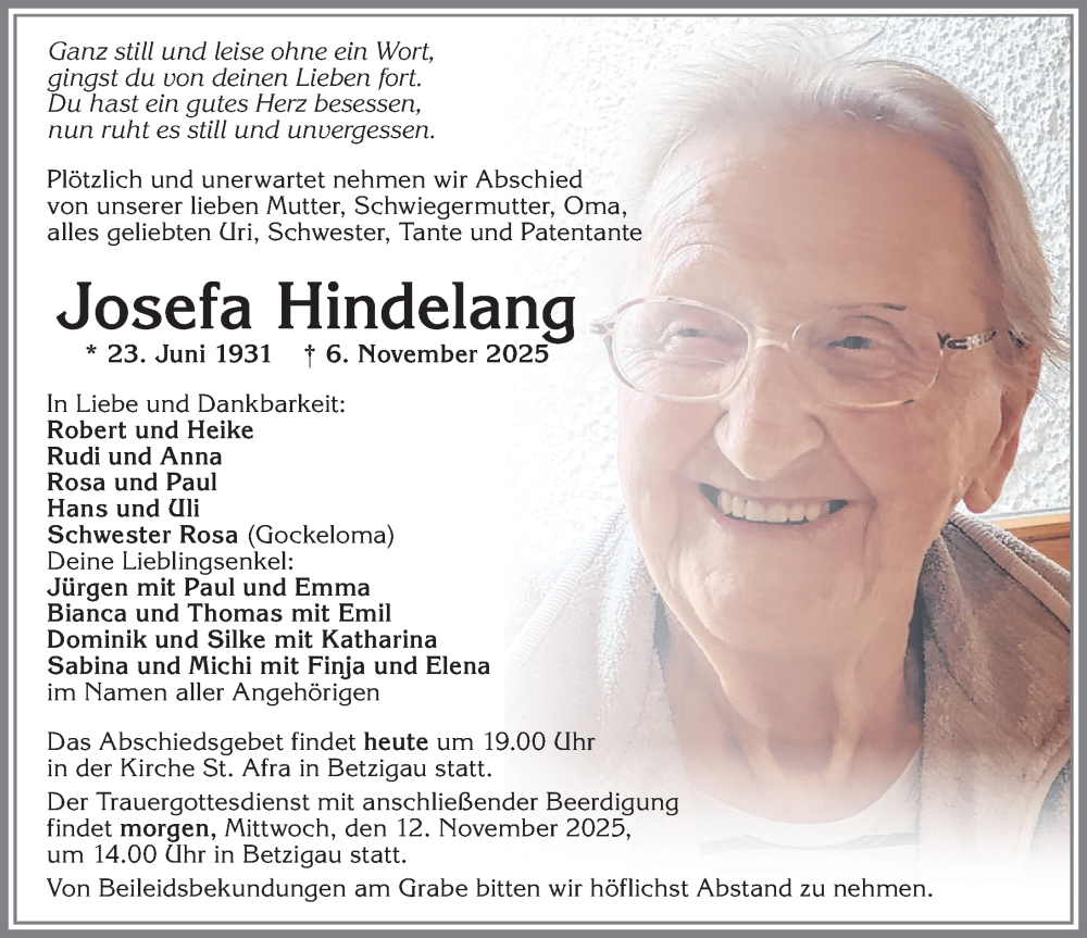 Hier finden Sie alle Traueranzeigen aus der Zeitung, die bisher für Josefa Hindelang erschienen sind. Weitere Traueranzeigen, die in der Zeitung erscheinen, werden hier ebenfalls aufgelistet