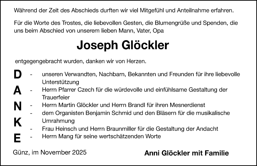Hier finden Sie alle Traueranzeigen aus der Zeitung, die bisher für Joseph Glöckler erschienen sind. Weitere Traueranzeigen, die in der Zeitung erscheinen, werden hier ebenfalls aufgelistet