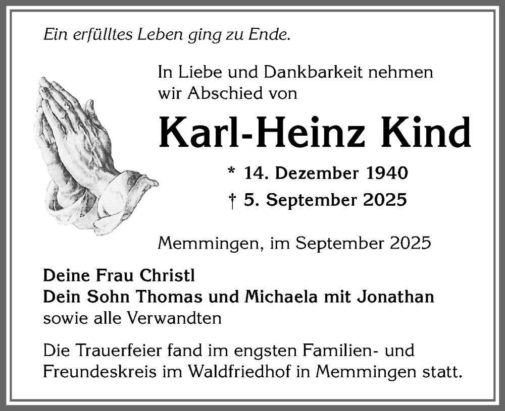 Hier finden Sie alle Traueranzeigen aus der Zeitung, die bisher für Karl-Heinz Kind erschienen sind. Weitere Traueranzeigen, die in der Zeitung erscheinen, werden hier ebenfalls aufgelistet