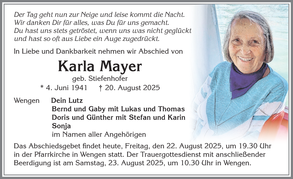 Hier finden Sie alle Traueranzeigen aus der Zeitung, die bisher für Karla Mayer erschienen sind. Weitere Traueranzeigen, die in der Zeitung erscheinen, werden hier ebenfalls aufgelistet