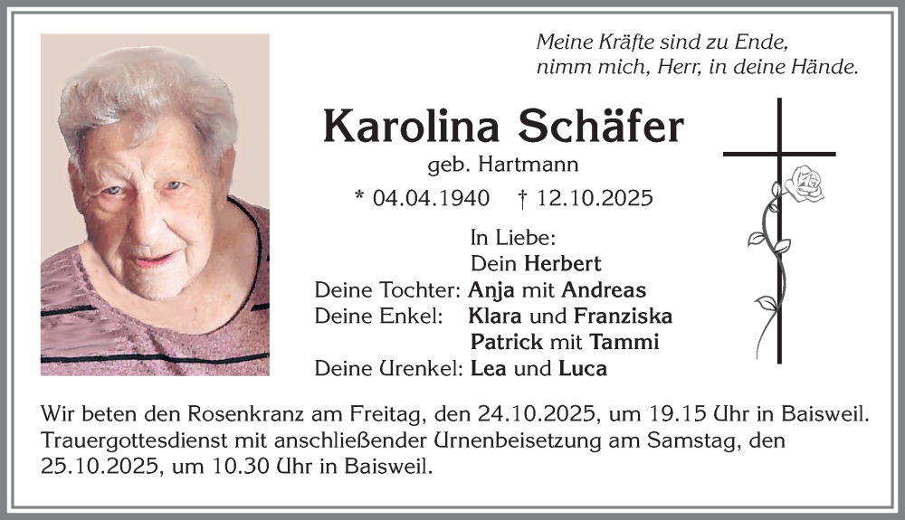 Hier finden Sie alle Traueranzeigen aus der Zeitung, die bisher für Karolina Schäfer erschienen sind. Weitere Traueranzeigen, die in der Zeitung erscheinen, werden hier ebenfalls aufgelistet