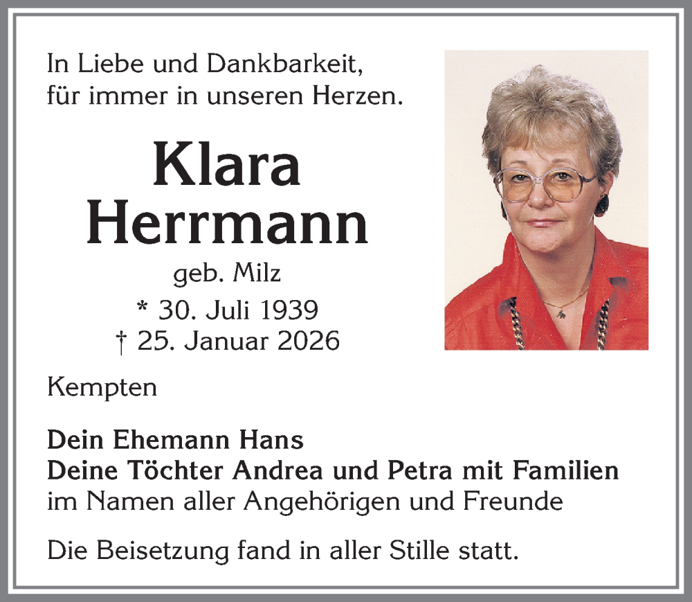 Hier finden Sie alle Traueranzeigen aus der Zeitung, die bisher für Klara Herrmann erschienen sind. Weitere Traueranzeigen, die in der Zeitung erscheinen, werden hier ebenfalls aufgelistet
