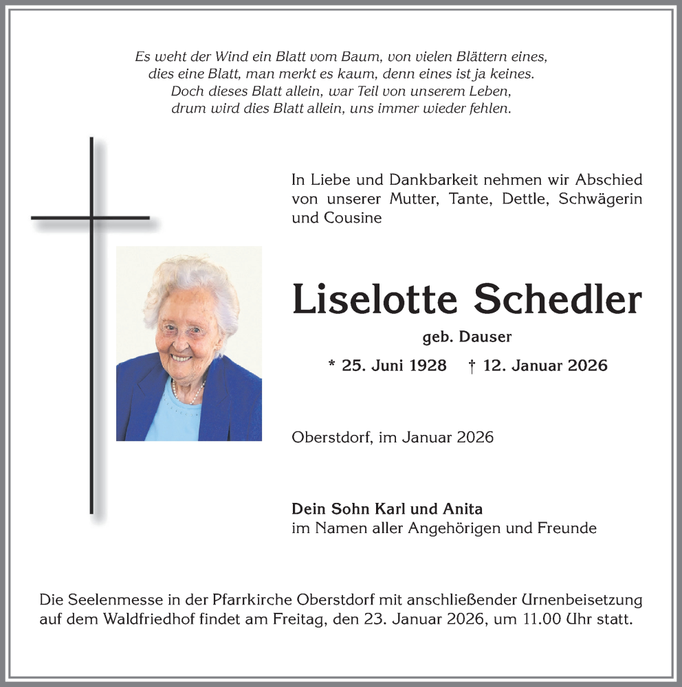 Hier finden Sie alle Traueranzeigen aus der Zeitung, die bisher für Liselotte Schedler erschienen sind. Weitere Traueranzeigen, die in der Zeitung erscheinen, werden hier ebenfalls aufgelistet