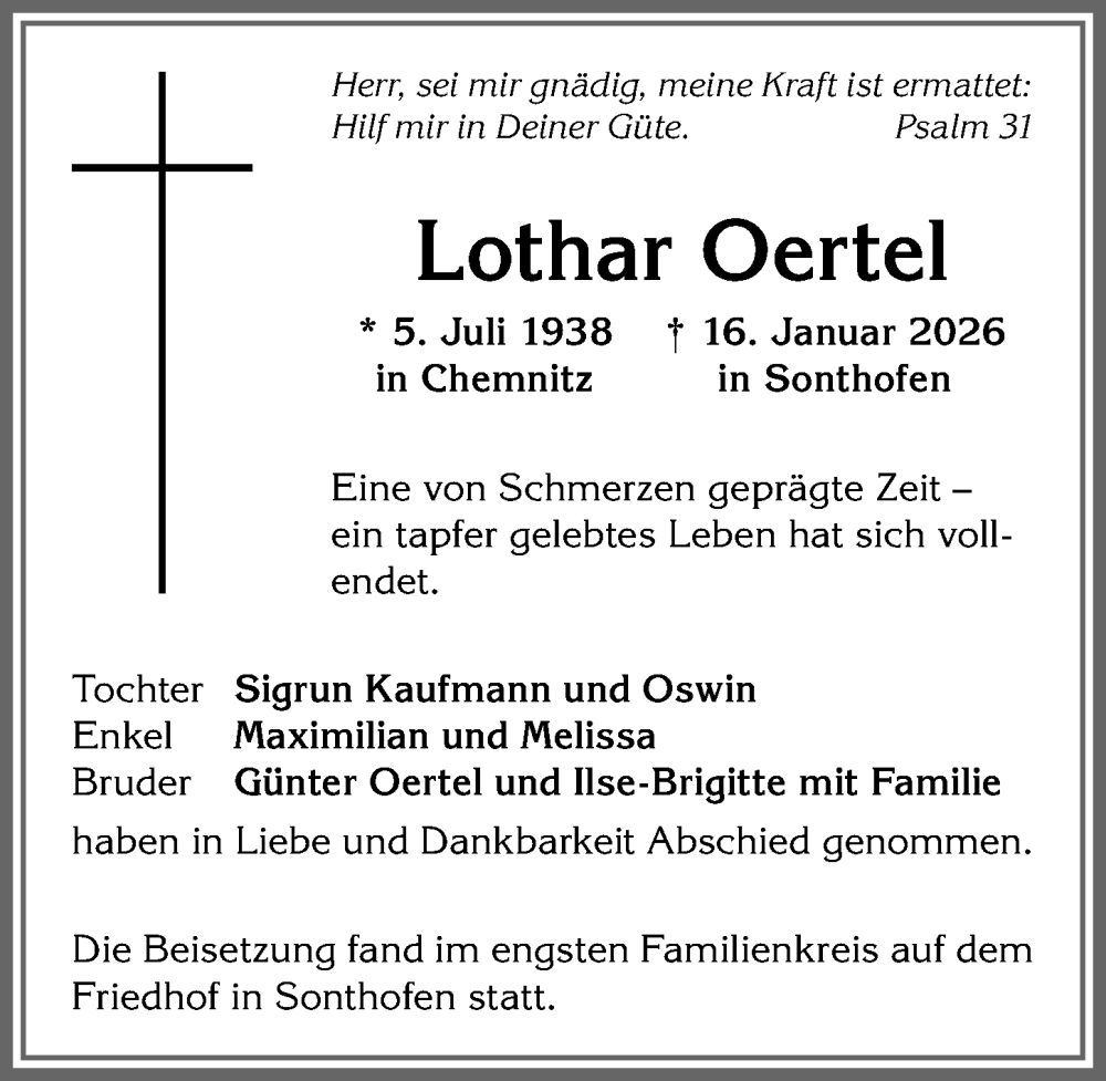 Hier finden Sie alle Traueranzeigen aus der Zeitung, die bisher für Lothar Oertel erschienen sind. Weitere Traueranzeigen, die in der Zeitung erscheinen, werden hier ebenfalls aufgelistet