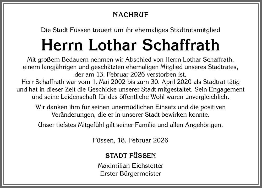Hier finden Sie alle Traueranzeigen aus der Zeitung, die bisher für Lothar Schaffrath erschienen sind. Weitere Traueranzeigen, die in der Zeitung erscheinen, werden hier ebenfalls aufgelistet