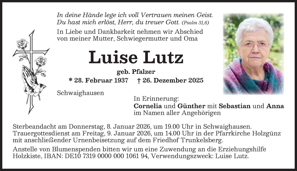 Hier finden Sie alle Traueranzeigen aus der Zeitung, die bisher für Luise Lutz erschienen sind. Weitere Traueranzeigen, die in der Zeitung erscheinen, werden hier ebenfalls aufgelistet