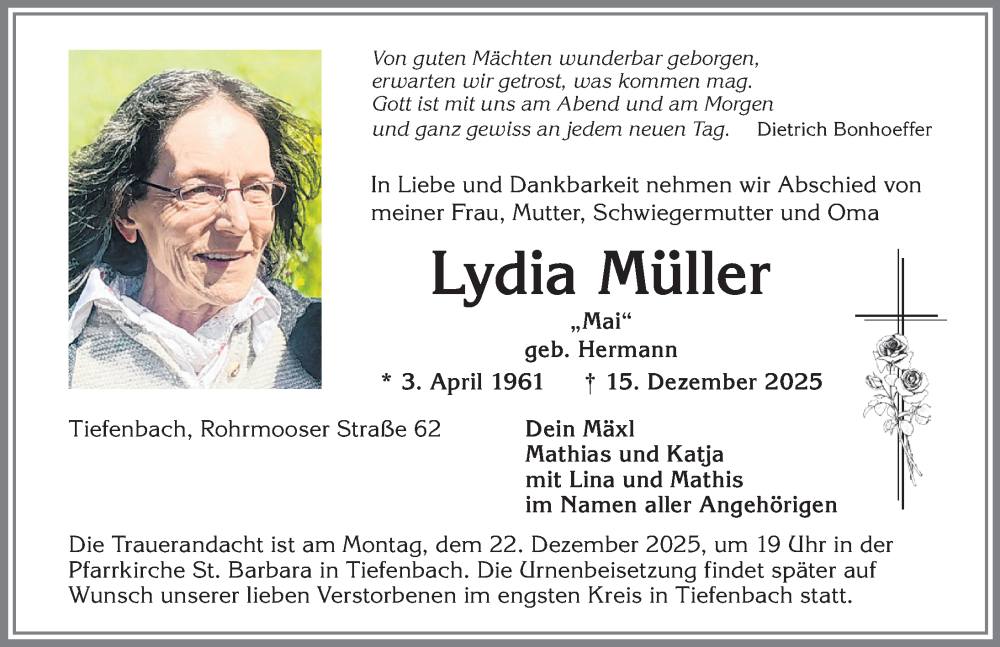 Hier finden Sie alle Traueranzeigen aus der Zeitung, die bisher für Lydia Müller erschienen sind. Weitere Traueranzeigen, die in der Zeitung erscheinen, werden hier ebenfalls aufgelistet