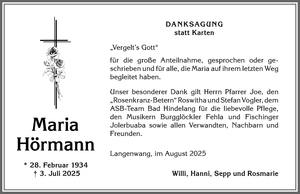 Hier finden Sie alle Traueranzeigen aus der Zeitung, die bisher für Maria Hörmann erschienen sind. Weitere Traueranzeigen, die in der Zeitung erscheinen, werden hier ebenfalls aufgelistet