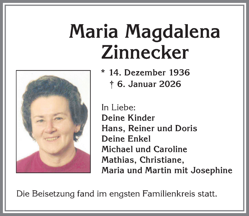 Hier finden Sie alle Traueranzeigen aus der Zeitung, die bisher für Maria Magdalena Zinnecker erschienen sind. Weitere Traueranzeigen, die in der Zeitung erscheinen, werden hier ebenfalls aufgelistet