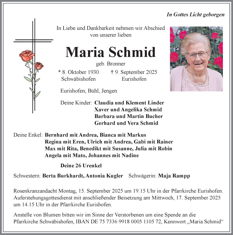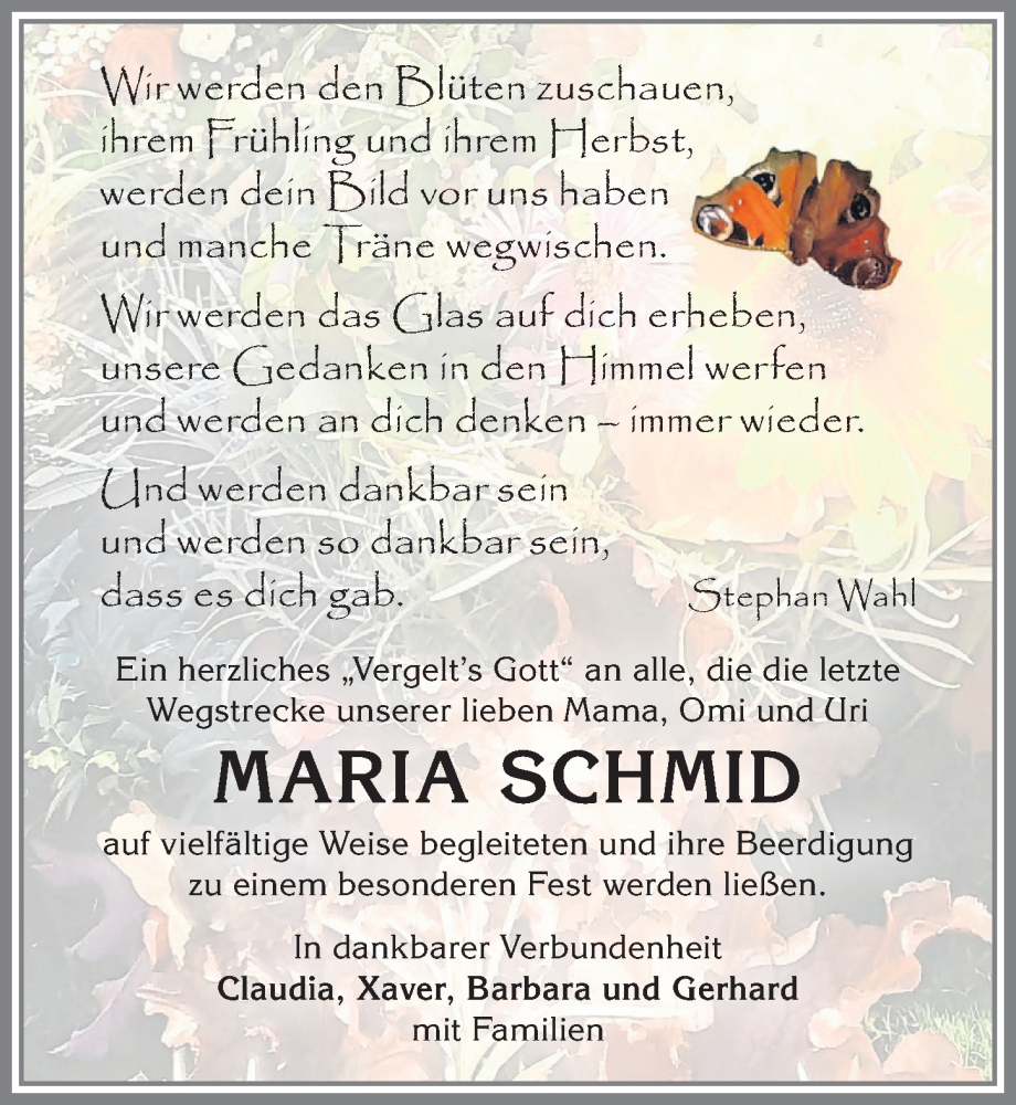 Hier finden Sie alle Traueranzeigen aus der Zeitung, die bisher für Maria Schmid erschienen sind. Weitere Traueranzeigen, die in der Zeitung erscheinen, werden hier ebenfalls aufgelistet