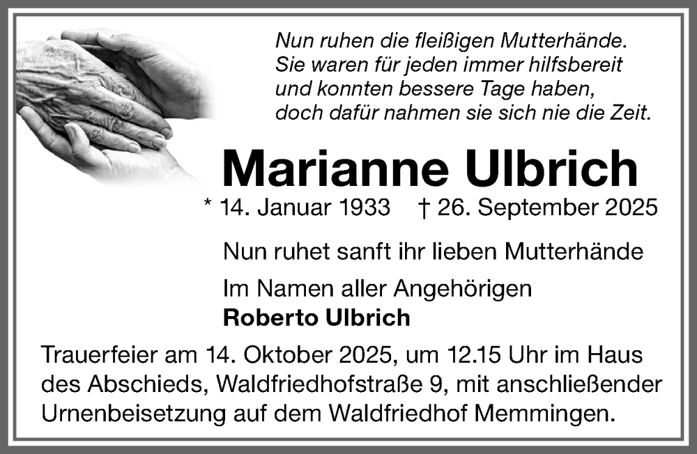 Hier finden Sie alle Traueranzeigen aus der Zeitung, die bisher für Marianne Ulbrich erschienen sind. Weitere Traueranzeigen, die in der Zeitung erscheinen, werden hier ebenfalls aufgelistet