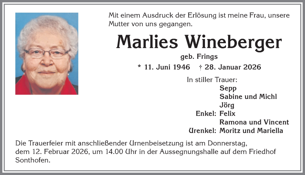 Hier finden Sie alle Traueranzeigen aus der Zeitung, die bisher für Marlies Wineberger erschienen sind. Weitere Traueranzeigen, die in der Zeitung erscheinen, werden hier ebenfalls aufgelistet