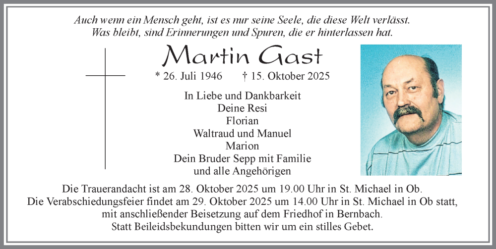 Hier finden Sie alle Traueranzeigen aus der Zeitung, die bisher für Martin Gast erschienen sind. Weitere Traueranzeigen, die in der Zeitung erscheinen, werden hier ebenfalls aufgelistet