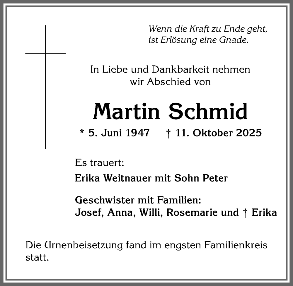 Hier finden Sie alle Traueranzeigen aus der Zeitung, die bisher für Martin Schmid erschienen sind. Weitere Traueranzeigen, die in der Zeitung erscheinen, werden hier ebenfalls aufgelistet