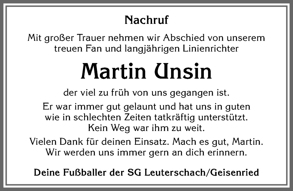 Hier finden Sie alle Traueranzeigen aus der Zeitung, die bisher für Martin Unsin erschienen sind. Weitere Traueranzeigen, die in der Zeitung erscheinen, werden hier ebenfalls aufgelistet