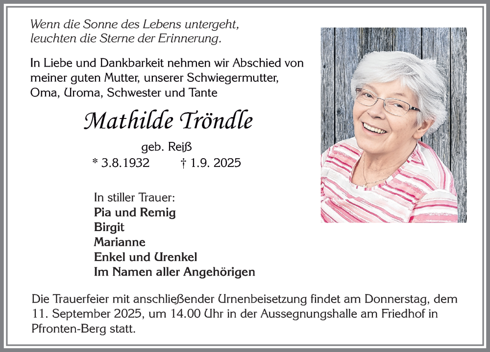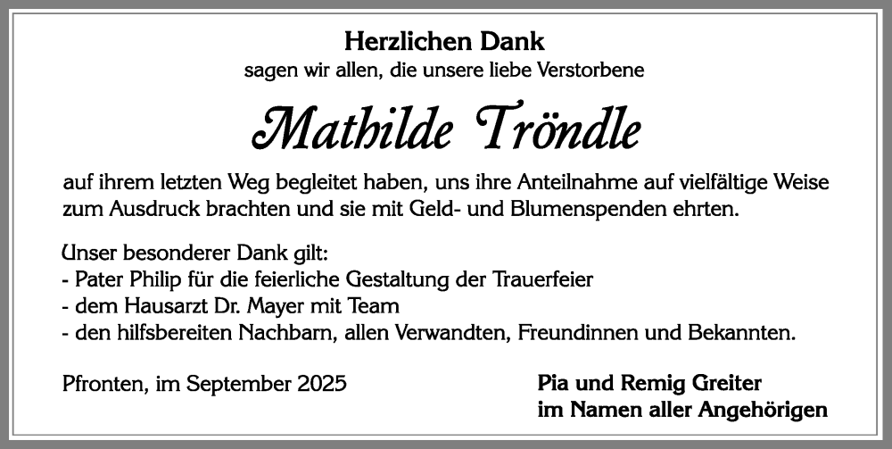 Hier finden Sie alle Traueranzeigen aus der Zeitung, die bisher für Mathilde Tröndle erschienen sind. Weitere Traueranzeigen, die in der Zeitung erscheinen, werden hier ebenfalls aufgelistet