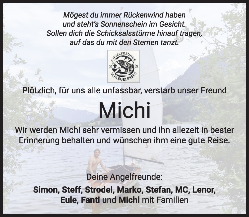 Hier finden Sie alle Traueranzeigen aus der Zeitung, die bisher für Michi erschienen sind. Weitere Traueranzeigen, die in der Zeitung erscheinen, werden hier ebenfalls aufgelistet