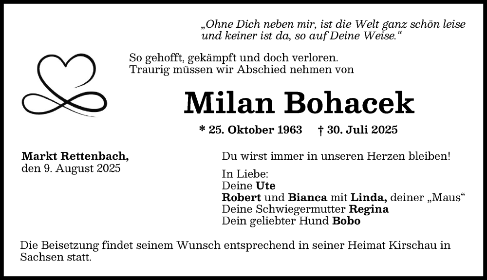 Hier finden Sie alle Traueranzeigen aus der Zeitung, die bisher für Milan Bohacek erschienen sind. Weitere Traueranzeigen, die in der Zeitung erscheinen, werden hier ebenfalls aufgelistet