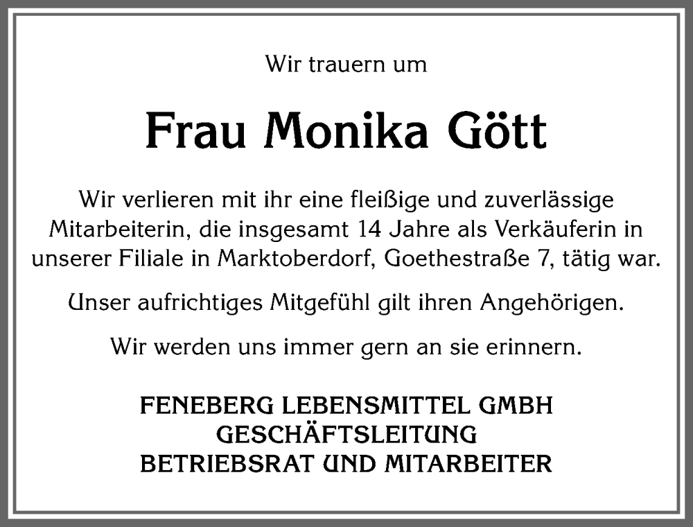 Hier finden Sie alle Traueranzeigen aus der Zeitung, die bisher für Monika Gött erschienen sind. Weitere Traueranzeigen, die in der Zeitung erscheinen, werden hier ebenfalls aufgelistet