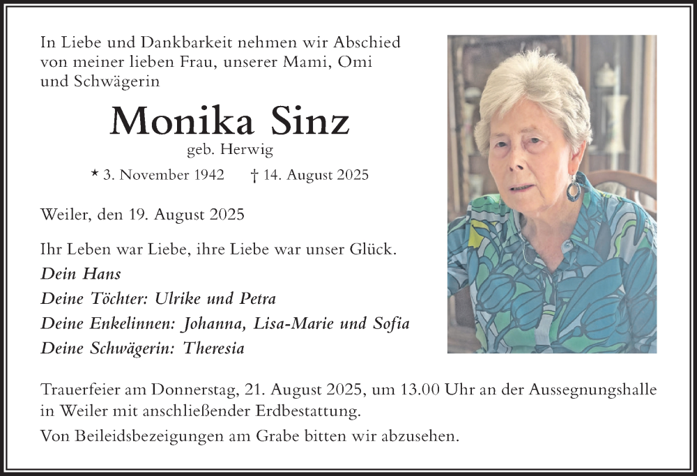 Hier finden Sie alle Traueranzeigen aus der Zeitung, die bisher für Monika Sinz erschienen sind. Weitere Traueranzeigen, die in der Zeitung erscheinen, werden hier ebenfalls aufgelistet