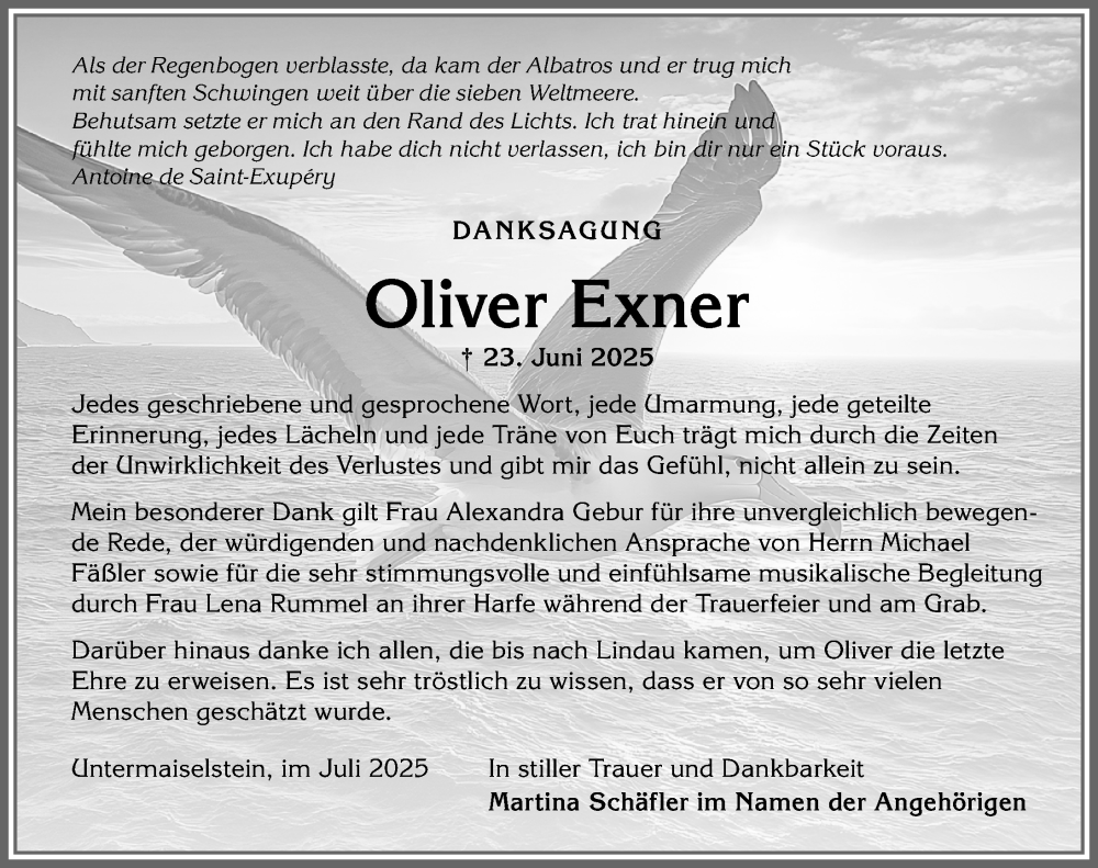 Hier finden Sie alle Traueranzeigen aus der Zeitung, die bisher für Oliver Exner erschienen sind. Weitere Traueranzeigen, die in der Zeitung erscheinen, werden hier ebenfalls aufgelistet